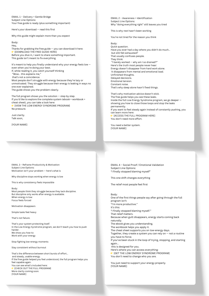 A professionally written, fully editable eBook that forms the foundation of Low Energy Syndrome – Why You’re Always Tired — And How to Feel Energized Again Without Motivation, Caffeine, or Burnout.
